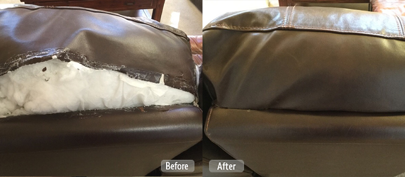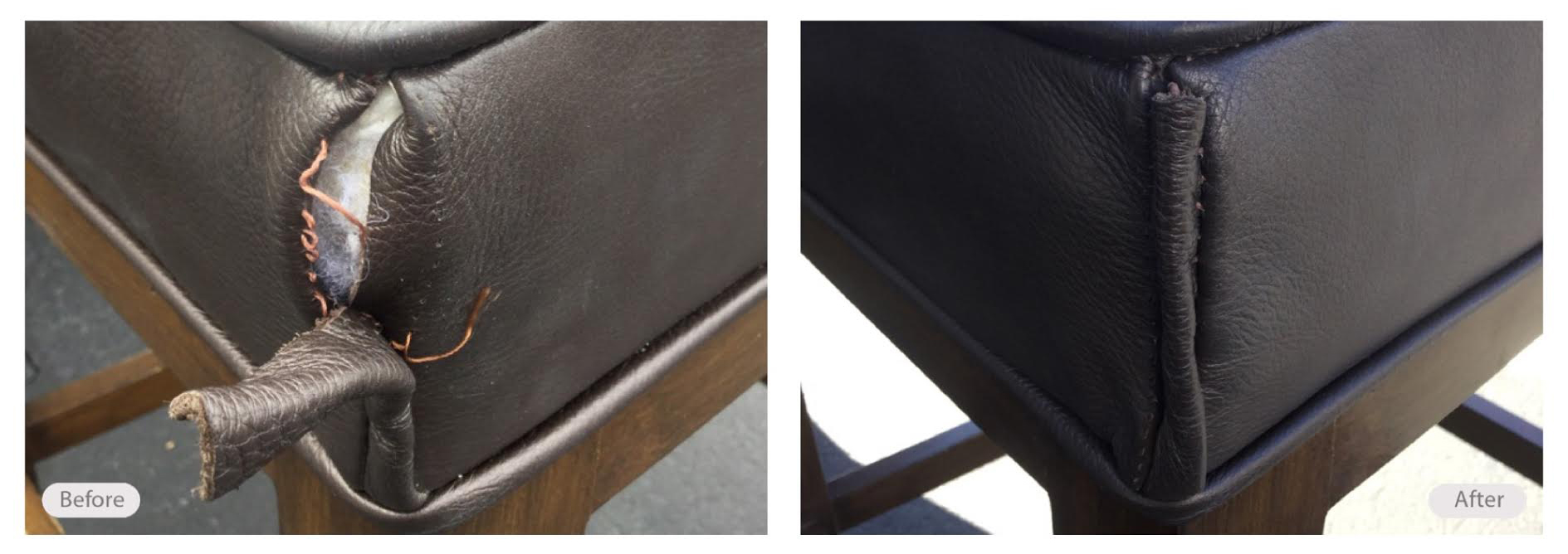 While we are not full-blown upholsterers, we have the skill and tools to offer common on-site upholstery repairs such as split cushion seams, dustcover replacement, button replacement, wobbly leg repair, foam replacement, fixing squeaky frames, spring replacement, recliner mechanism repair and replacement, torn corner repair and more.